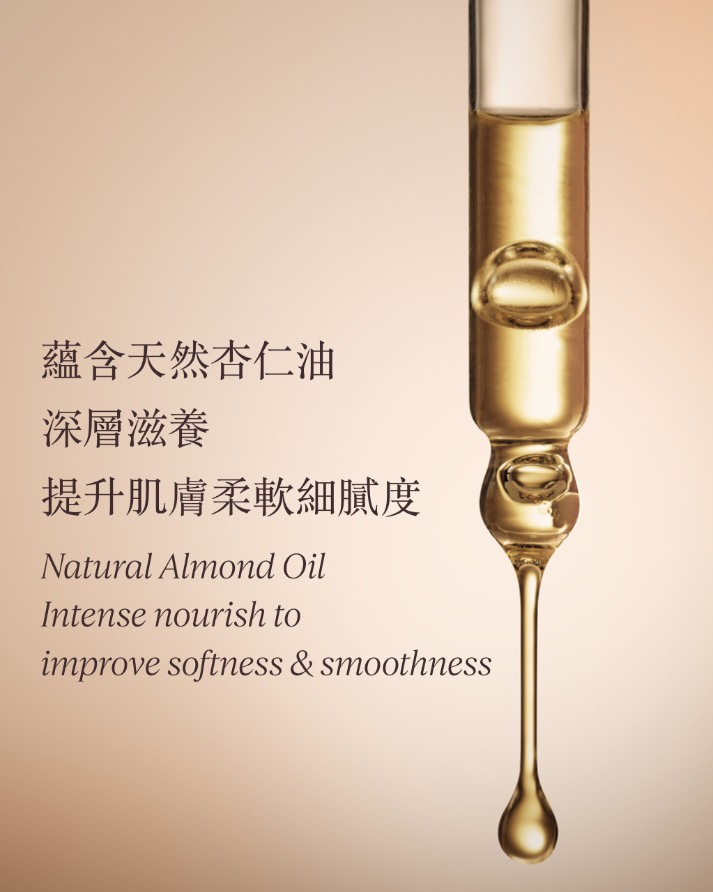 蘊含天然杏仁油,源自大自然培育6年的珍貴杏仁果實,深層滋養,提升肌膚柔軟細膩度。