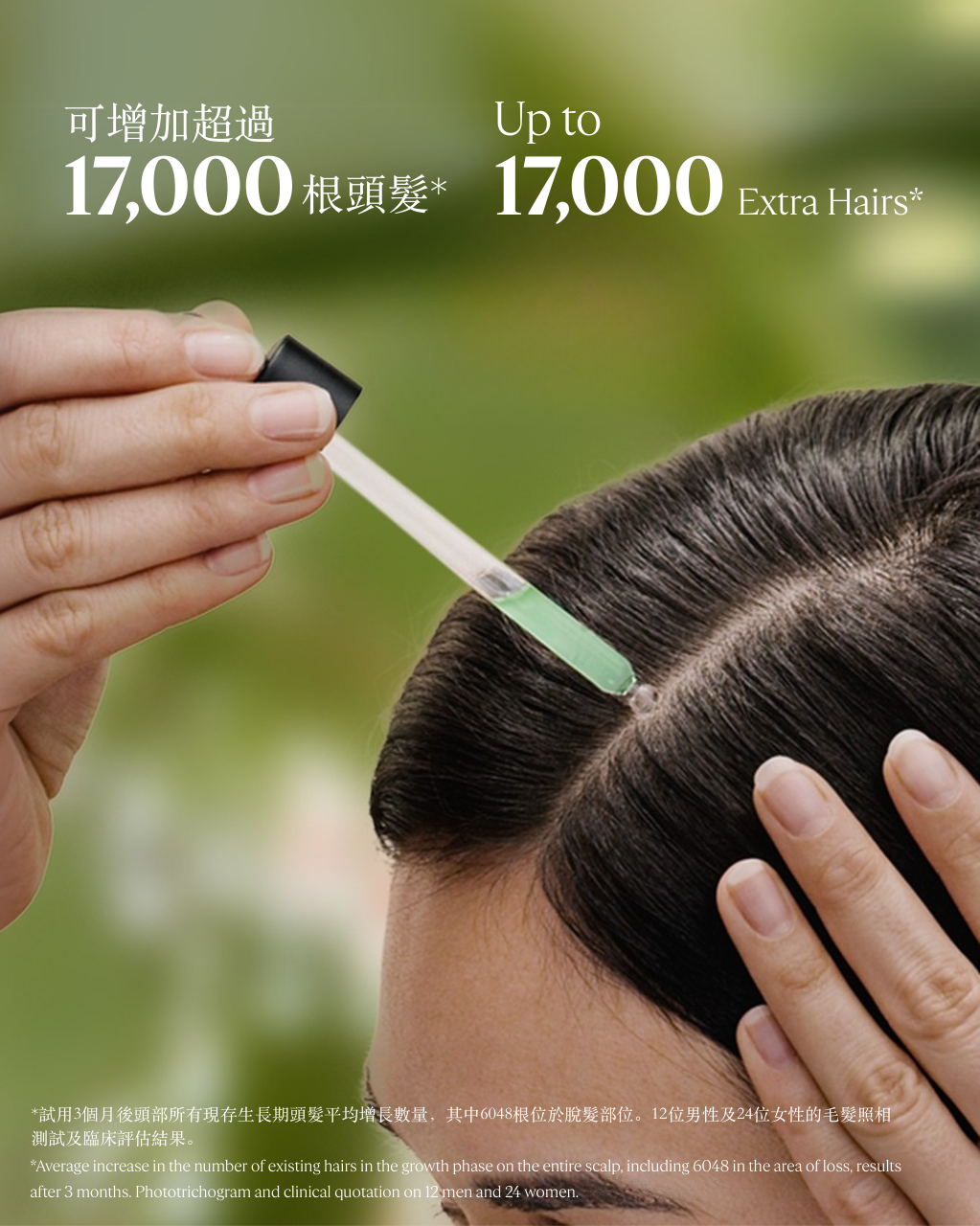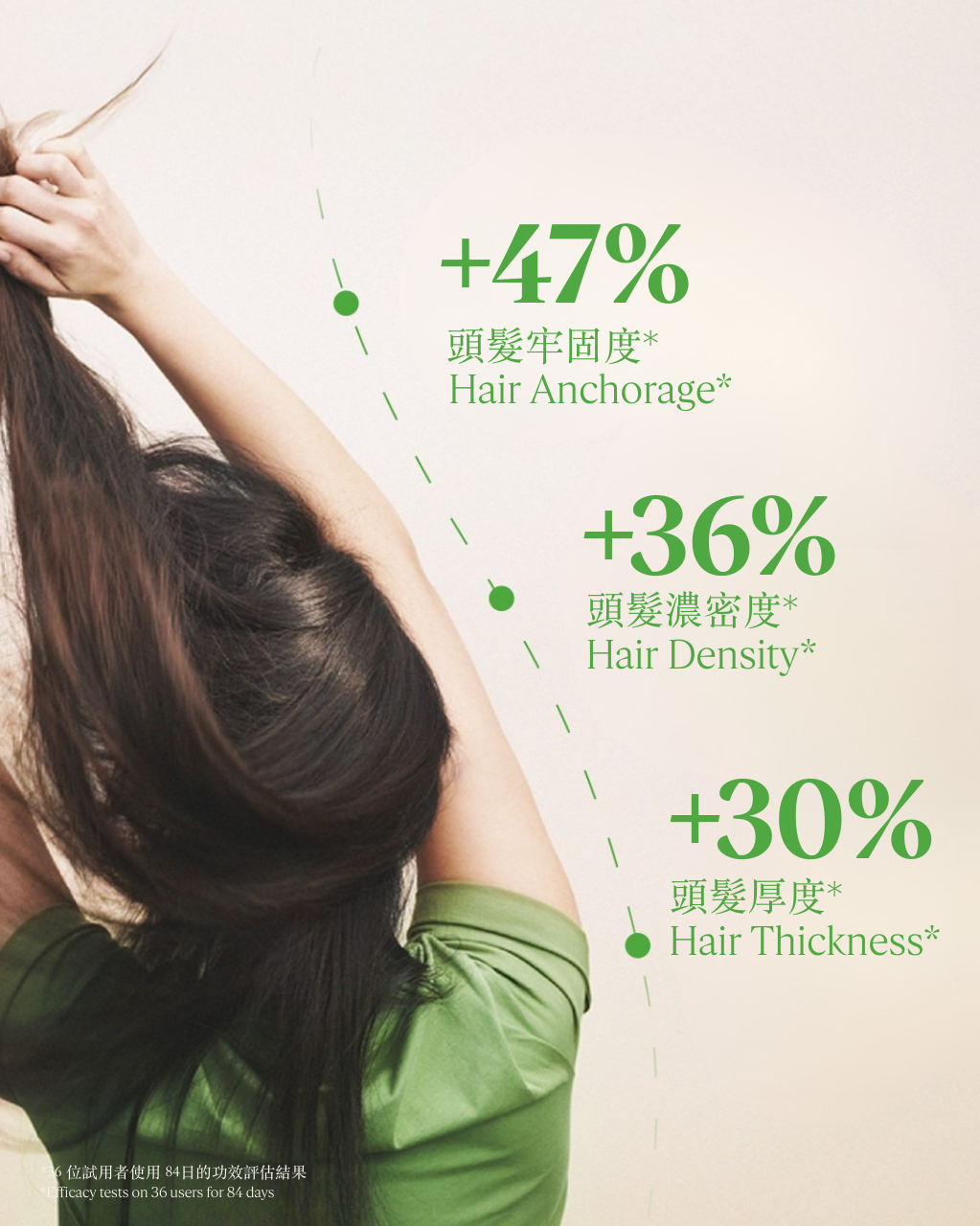 全港銷量NO.1防掉髮精華*,可增加超過17,000根頭髮**,提升47%頭髮牢固度,36%頭髮濃密度以及30%頭髮厚度^