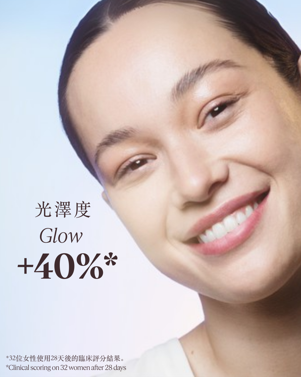 **32位女性使用28天後的臨床評分結果:肌膚光澤度+40%